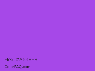 Hex #a648e8 Color is a normal purple color and the nearest color is Navy Purple #9457eb. Hex code #a648e8 and RGB value is rgb(166,72,232). In RGB color space, this color is composed of 65% red, 28% green, 91% blue, In CMYK color space, this color is composed of 28% cyan, 69% magenta, 0% yellow , 9% black , In HSL color space, this color has a hue angle of 275° , 78% saturation and 60% lightness.
