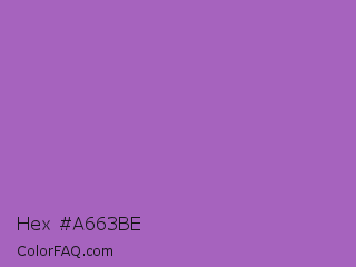Hex #a663be Color is a normal purple color and the nearest color is Rich Lavender #a76bcf. Hex code #a663be and RGB value is rgb(166,99,190). In RGB color space, this color is composed of 65% red, 39% green, 75% blue, In CMYK color space, this color is composed of 13% cyan, 48% magenta, 0% yellow , 25% black , In HSL color space, this color has a hue angle of 284° , 41% saturation and 57% lightness.