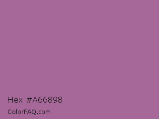 Hex #a66898 Color is a normal magenta color and the nearest color is Pearly Purple #b768a2. Hex code #a66898 and RGB value is rgb(166,104,152). In RGB color space, this color is composed of 65% red, 41% green, 60% blue, In CMYK color space, this color is composed of 0% cyan, 37% magenta, 8% yellow , 35% black , In HSL color space, this color has a hue angle of 314° , 26% saturation and 53% lightness.