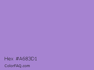 Hex #a683d1 Color is a light violet color and the nearest color is East Side #ac91ce. Hex code #a683d1 and RGB value is rgb(166,131,209). In RGB color space, this color is composed of 65% red, 51% green, 82% blue, In CMYK color space, this color is composed of 21% cyan, 37% magenta, 0% yellow , 18% black , In HSL color space, this color has a hue angle of 267° , 46% saturation and 67% lightness.