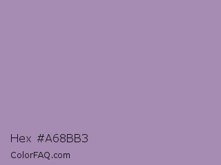 Hex #a68bb3 Color is a light purple color and the nearest color is Glossy Grape #ab92b3. Hex code #a68bb3 and RGB value is rgb(166,139,179). In RGB color space, this color is composed of 65% red, 55% green, 70% blue, In CMYK color space, this color is composed of 7% cyan, 22% magenta, 0% yellow , 30% black , In HSL color space, this color has a hue angle of 281° , 21% saturation and 62% lightness.