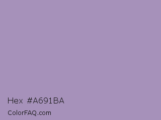 Hex #a691ba Color is a light purple color and the nearest color is Glossy Grape #ab92b3. Hex code #a691ba and RGB value is rgb(166,145,186). In RGB color space, this color is composed of 65% red, 57% green, 73% blue, In CMYK color space, this color is composed of 11% cyan, 22% magenta, 0% yellow , 27% black , In HSL color space, this color has a hue angle of 271° , 23% saturation and 65% lightness.