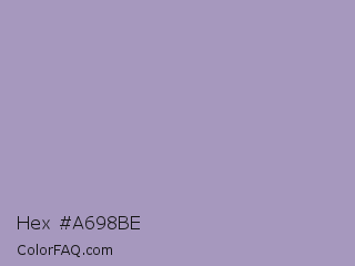 Hex #a698be Color is a light violet color and the nearest color is Amethyst Smoke #a397b4. Hex code #a698be and RGB value is rgb(166,152,190). In RGB color space, this color is composed of 65% red, 60% green, 75% blue, In CMYK color space, this color is composed of 13% cyan, 20% magenta, 0% yellow , 25% black , In HSL color space, this color has a hue angle of 262° , 23% saturation and 67% lightness.
