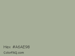 Hex #a6ae98 Color is a light green color and the nearest color is Bud #a8ae9c. Hex code #a6ae98 and RGB value is rgb(166,174,152). In RGB color space, this color is composed of 65% red, 68% green, 60% blue, In CMYK color space, this color is composed of 5% cyan, 0% magenta, 13% yellow , 32% black , In HSL color space, this color has a hue angle of 82° , 12% saturation and 64% lightness.