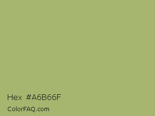 Hex #a6b66f Color is a normal lime color and the nearest color is Green Smoke #a4af6e. Hex code #a6b66f and RGB value is rgb(166,182,111). In RGB color space, this color is composed of 65% red, 71% green, 44% blue, In CMYK color space, this color is composed of 9% cyan, 0% magenta, 39% yellow , 29% black , In HSL color space, this color has a hue angle of 74° , 33% saturation and 57% lightness.