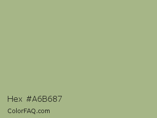 Hex #a6b687 Color is a light green color and the nearest color is Swamp Green #acb78e. Hex code #a6b687 and RGB value is rgb(166,182,135). In RGB color space, this color is composed of 65% red, 71% green, 53% blue, In CMYK color space, this color is composed of 9% cyan, 0% magenta, 26% yellow , 29% black , In HSL color space, this color has a hue angle of 80° , 24% saturation and 62% lightness.