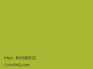 Hex #a6b831 Color is a normal yellow color and the nearest color is Android Green #a4c639. Hex code #a6b831 and RGB value is rgb(166,184,49). In RGB color space, this color is composed of 65% red, 72% green, 19% blue, In CMYK color space, this color is composed of 10% cyan, 0% magenta, 73% yellow , 28% black , In HSL color space, this color has a hue angle of 68° , 58% saturation and 46% lightness.