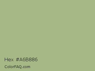 Hex #a6b886 Color is a light green color and the nearest color is Swamp Green #acb78e. Hex code #a6b886 and RGB value is rgb(166,184,134). In RGB color space, this color is composed of 65% red, 72% green, 53% blue, In CMYK color space, this color is composed of 10% cyan, 0% magenta, 27% yellow , 28% black , In HSL color space, this color has a hue angle of 82° , 26% saturation and 62% lightness.