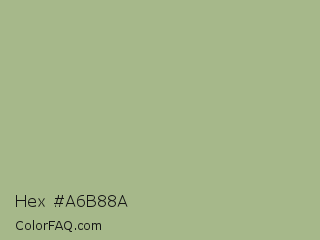 Hex #a6b88a Color is a light green color and the nearest color is Swamp Green #acb78e. Hex code #a6b88a and RGB value is rgb(166,184,138). In RGB color space, this color is composed of 65% red, 72% green, 54% blue, In CMYK color space, this color is composed of 10% cyan, 0% magenta, 25% yellow , 28% black , In HSL color space, this color has a hue angle of 83° , 24% saturation and 63% lightness.