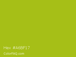 Hex #a6bf17 Color is a normal yellow color and the nearest color is Acid Green #b0bf1a. Hex code #a6bf17 and RGB value is rgb(166,191,23). In RGB color space, this color is composed of 65% red, 75% green, 9% blue, In CMYK color space, this color is composed of 13% cyan, 0% magenta, 88% yellow , 25% black , In HSL color space, this color has a hue angle of 69° , 79% saturation and 42% lightness.
