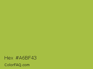 Hex #a6bf43 Color is a normal lime color and the nearest color is Android Green #a4c639. Hex code #a6bf43 and RGB value is rgb(166,191,67). In RGB color space, this color is composed of 65% red, 75% green, 26% blue, In CMYK color space, this color is composed of 13% cyan, 0% magenta, 65% yellow , 25% black , In HSL color space, this color has a hue angle of 72° , 49% saturation and 51% lightness.