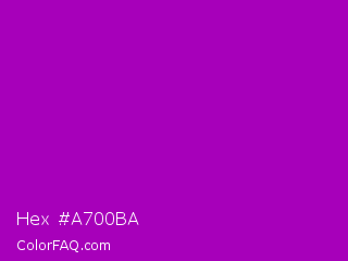 Hex #a700ba Color is a normal magenta color and the nearest color is Heliotrope Magenta #aa00bb. Hex code #a700ba and RGB value is rgb(167,0,186). In RGB color space, this color is composed of 65% red, 0% green, 73% blue, In CMYK color space, this color is composed of 10% cyan, 100% magenta, 0% yellow , 27% black , In HSL color space, this color has a hue angle of 294° , 100% saturation and 36% lightness.