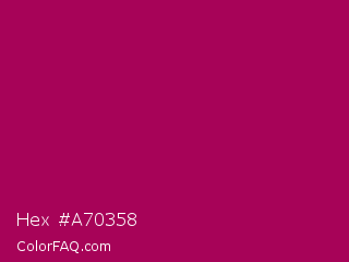 Hex #a70358 Color is a normal rose color and the nearest color is Jazzberry Jam #a50b5e. Hex code #a70358 and RGB value is rgb(167,3,88). In RGB color space, this color is composed of 65% red, 1% green, 35% blue, In CMYK color space, this color is composed of 0% cyan, 98% magenta, 47% yellow , 35% black , In HSL color space, this color has a hue angle of 329° , 96% saturation and 33% lightness.