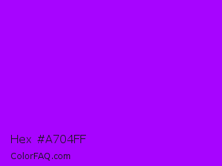 Hex #a704ff Color is a normal purple color and the nearest color is Vivid Violet #9f00ff. Hex code #a704ff and RGB value is rgb(167,4,255). In RGB color space, this color is composed of 65% red, 2% green, 100% blue, In CMYK color space, this color is composed of 35% cyan, 98% magenta, 0% yellow , 0% black , In HSL color space, this color has a hue angle of 279° , 100% saturation and 51% lightness.
