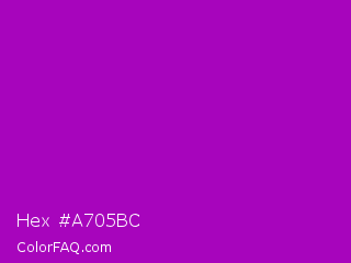 Hex #a705bc Color is a normal magenta color and the nearest color is Heliotrope Magenta #aa00bb. Hex code #a705bc and RGB value is rgb(167,5,188). In RGB color space, this color is composed of 65% red, 2% green, 74% blue, In CMYK color space, this color is composed of 11% cyan, 97% magenta, 0% yellow , 26% black , In HSL color space, this color has a hue angle of 293° , 95% saturation and 38% lightness.