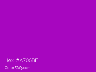 Hex #a706bf Color is a normal magenta color and the nearest color is Heliotrope Magenta #aa00bb. Hex code #a706bf and RGB value is rgb(167,6,191). In RGB color space, this color is composed of 65% red, 2% green, 75% blue, In CMYK color space, this color is composed of 13% cyan, 97% magenta, 0% yellow , 25% black , In HSL color space, this color has a hue angle of 292° , 94% saturation and 39% lightness.