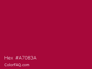 Hex #a7083a Color is a normal rose color and the nearest color is Shiraz #b20931. Hex code #a7083a and RGB value is rgb(167,8,58). In RGB color space, this color is composed of 65% red, 3% green, 23% blue, In CMYK color space, this color is composed of 0% cyan, 95% magenta, 65% yellow , 35% black , In HSL color space, this color has a hue angle of 341° , 91% saturation and 34% lightness.