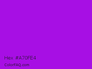 Hex #a70fe4 Color is a normal purple color and the nearest color is Vivid Mulberry #b80ce3. Hex code #a70fe4 and RGB value is rgb(167,15,228). In RGB color space, this color is composed of 65% red, 6% green, 89% blue, In CMYK color space, this color is composed of 27% cyan, 93% magenta, 0% yellow , 11% black , In HSL color space, this color has a hue angle of 283° , 88% saturation and 48% lightness.