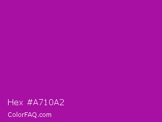 Hex #a710a2 Color is a normal magenta color and the nearest color is Violet Eggplant #991199. Hex code #a710a2 and RGB value is rgb(167,16,162). In RGB color space, this color is composed of 65% red, 6% green, 64% blue, In CMYK color space, this color is composed of 0% cyan, 90% magenta, 3% yellow , 35% black , In HSL color space, this color has a hue angle of 302° , 83% saturation and 36% lightness.