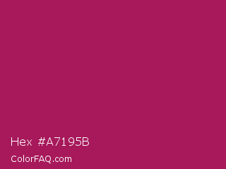 Hex #a7195b Color is a normal rose color and the nearest color is Jazzberry Jam #a50b5e. Hex code #a7195b and RGB value is rgb(167,25,91). In RGB color space, this color is composed of 65% red, 10% green, 36% blue, In CMYK color space, this color is composed of 0% cyan, 85% magenta, 46% yellow , 35% black , In HSL color space, this color has a hue angle of 332° , 74% saturation and 38% lightness.