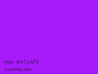 Hex #a71af9 Color is a normal purple color and the nearest color is Veronica #a020f0. Hex code #a71af9 and RGB value is rgb(167,26,249). In RGB color space, this color is composed of 65% red, 10% green, 98% blue, In CMYK color space, this color is composed of 33% cyan, 90% magenta, 0% yellow , 2% black , In HSL color space, this color has a hue angle of 278° , 95% saturation and 54% lightness.