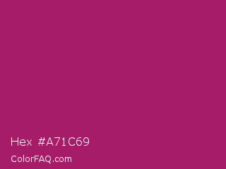 Hex #a71c69 Color is a normal magenta color and the nearest color is Amaranth Deep Purple #9f2b68. Hex code #a71c69 and RGB value is rgb(167,28,105). In RGB color space, this color is composed of 65% red, 11% green, 41% blue, In CMYK color space, this color is composed of 0% cyan, 83% magenta, 37% yellow , 35% black , In HSL color space, this color has a hue angle of 327° , 71% saturation and 38% lightness.
