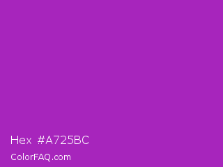 Hex #a725bc Color is a normal magenta color and the nearest color is Dark Orchid #9932cc. Hex code #a725bc and RGB value is rgb(167,37,188). In RGB color space, this color is composed of 65% red, 15% green, 74% blue, In CMYK color space, this color is composed of 11% cyan, 80% magenta, 0% yellow , 26% black , In HSL color space, this color has a hue angle of 292° , 67% saturation and 44% lightness.