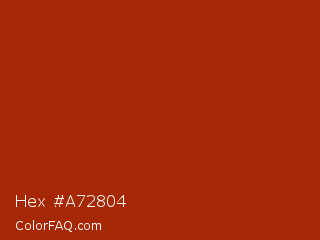 Hex #a72804 Color is a normal red color and the nearest color is Rufous #a81c07. Hex code #a72804 and RGB value is rgb(167,40,4). In RGB color space, this color is composed of 65% red, 16% green, 2% blue, In CMYK color space, this color is composed of 0% cyan, 76% magenta, 98% yellow , 35% black , In HSL color space, this color has a hue angle of 13° , 95% saturation and 34% lightness.