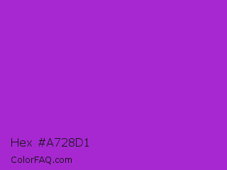 Hex #a728d1 Color is a normal purple color and the nearest color is Dark Orchid #9932cc. Hex code #a728d1 and RGB value is rgb(167,40,209). In RGB color space, this color is composed of 65% red, 16% green, 82% blue, In CMYK color space, this color is composed of 20% cyan, 81% magenta, 0% yellow , 18% black , In HSL color space, this color has a hue angle of 285° , 68% saturation and 49% lightness.