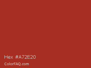 Hex #a72e20 Color is a normal red color and the nearest color is Roof Terracotta #a62f20. Hex code #a72e20 and RGB value is rgb(167,46,32). In RGB color space, this color is composed of 65% red, 18% green, 13% blue, In CMYK color space, this color is composed of 0% cyan, 72% magenta, 81% yellow , 35% black , In HSL color space, this color has a hue angle of 6° , 68% saturation and 39% lightness.