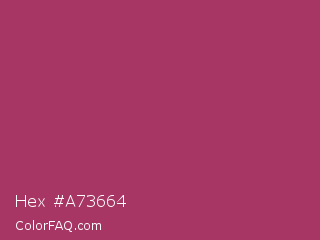Hex #a73664 Color is a normal rose color and the nearest color is Night Shadz #aa375a. Hex code #a73664 and RGB value is rgb(167,54,100). In RGB color space, this color is composed of 65% red, 21% green, 39% blue, In CMYK color space, this color is composed of 0% cyan, 68% magenta, 40% yellow , 35% black , In HSL color space, this color has a hue angle of 336° , 51% saturation and 43% lightness.