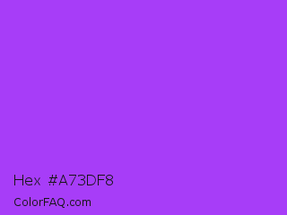 Hex #a73df8 Color is a light purple color and the nearest color is Veronica #a020f0. Hex code #a73df8 and RGB value is rgb(167,61,248). In RGB color space, this color is composed of 65% red, 24% green, 97% blue, In CMYK color space, this color is composed of 33% cyan, 75% magenta, 0% yellow , 3% black , In HSL color space, this color has a hue angle of 274° , 93% saturation and 61% lightness.