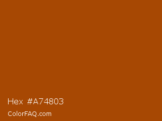 Hex #a74803 Color is a normal orange color and the nearest color is Fire #aa4203. Hex code #a74803 and RGB value is rgb(167,72,3). In RGB color space, this color is composed of 65% red, 28% green, 1% blue, In CMYK color space, this color is composed of 0% cyan, 57% magenta, 98% yellow , 35% black , In HSL color space, this color has a hue angle of 25° , 96% saturation and 33% lightness.