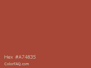 Hex #a74835 Color is a normal red color and the nearest color is Medium Carmine #af4035. Hex code #a74835 and RGB value is rgb(167,72,53). In RGB color space, this color is composed of 65% red, 28% green, 21% blue, In CMYK color space, this color is composed of 0% cyan, 57% magenta, 68% yellow , 35% black , In HSL color space, this color has a hue angle of 10° , 52% saturation and 43% lightness.