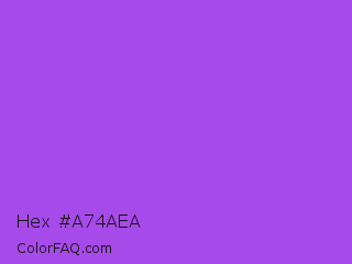 Hex #a74aea Color is a normal purple color and the nearest color is Navy Purple #9457eb. Hex code #a74aea and RGB value is rgb(167,74,234). In RGB color space, this color is composed of 65% red, 29% green, 92% blue, In CMYK color space, this color is composed of 29% cyan, 68% magenta, 0% yellow , 8% black , In HSL color space, this color has a hue angle of 275° , 79% saturation and 60% lightness.