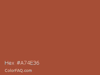 Hex #a74e36 Color is a normal red color and the nearest color is Paarl #a65529. Hex code #a74e36 and RGB value is rgb(167,78,54). In RGB color space, this color is composed of 65% red, 31% green, 21% blue, In CMYK color space, this color is composed of 0% cyan, 53% magenta, 68% yellow , 35% black , In HSL color space, this color has a hue angle of 13° , 51% saturation and 43% lightness.
