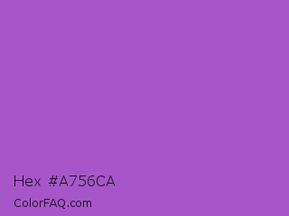 Hex #a756ca Color is a normal purple color and the nearest color is Deep Lilac #9955bb. Hex code #a756ca and RGB value is rgb(167,86,202). In RGB color space, this color is composed of 65% red, 34% green, 79% blue, In CMYK color space, this color is composed of 17% cyan, 57% magenta, 0% yellow , 21% black , In HSL color space, this color has a hue angle of 282° , 52% saturation and 56% lightness.