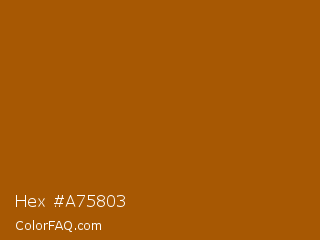 Hex #a75803 Color is a normal orange color and the nearest color is Windsor Tan #a75502. Hex code #a75803 and RGB value is rgb(167,88,3). In RGB color space, this color is composed of 65% red, 35% green, 1% blue, In CMYK color space, this color is composed of 0% cyan, 47% magenta, 98% yellow , 35% black , In HSL color space, this color has a hue angle of 31° , 96% saturation and 33% lightness.
