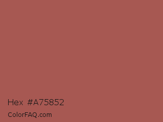 Hex #a75852 Color is a normal red color and the nearest color is Redwood #a45a52. Hex code #a75852 and RGB value is rgb(167,88,82). In RGB color space, this color is composed of 65% red, 35% green, 32% blue, In CMYK color space, this color is composed of 0% cyan, 47% magenta, 51% yellow , 35% black , In HSL color space, this color has a hue angle of 4° , 34% saturation and 49% lightness.