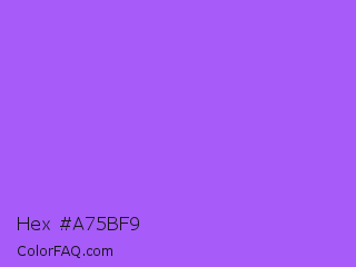 Hex #a75bf9 Color is a light violet color and the nearest color is Navy Purple #9457eb. Hex code #a75bf9 and RGB value is rgb(167,91,249). In RGB color space, this color is composed of 65% red, 36% green, 98% blue, In CMYK color space, this color is composed of 33% cyan, 63% magenta, 0% yellow , 2% black , In HSL color space, this color has a hue angle of 269° , 93% saturation and 67% lightness.