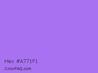 Hex #a771f1 Color is a light violet color and the nearest color is Lavender #b57edc. Hex code #a771f1 and RGB value is rgb(167,113,241). In RGB color space, this color is composed of 65% red, 44% green, 95% blue, In CMYK color space, this color is composed of 31% cyan, 53% magenta, 0% yellow , 5% black , In HSL color space, this color has a hue angle of 265° , 82% saturation and 69% lightness.