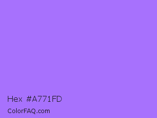Hex #a771fd Color is a light violet color and the nearest color is Navy Purple #9457eb. Hex code #a771fd and RGB value is rgb(167,113,253). In RGB color space, this color is composed of 65% red, 44% green, 99% blue, In CMYK color space, this color is composed of 34% cyan, 55% magenta, 0% yellow , 1% black , In HSL color space, this color has a hue angle of 263° , 97% saturation and 72% lightness.