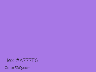 Hex #a777e6 Color is a light violet color and the nearest color is Lavender #b57edc. Hex code #a777e6 and RGB value is rgb(167,119,230). In RGB color space, this color is composed of 65% red, 47% green, 90% blue, In CMYK color space, this color is composed of 27% cyan, 48% magenta, 0% yellow , 10% black , In HSL color space, this color has a hue angle of 266° , 69% saturation and 68% lightness.
