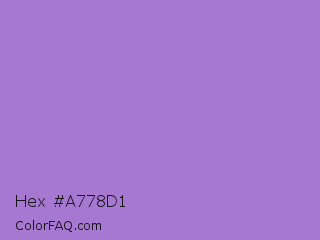Hex #a778d1 Color is a light purple color and the nearest color is Rich Lavender #a76bcf. Hex code #a778d1 and RGB value is rgb(167,120,209). In RGB color space, this color is composed of 65% red, 47% green, 82% blue, In CMYK color space, this color is composed of 20% cyan, 43% magenta, 0% yellow , 18% black , In HSL color space, this color has a hue angle of 272° , 49% saturation and 65% lightness.