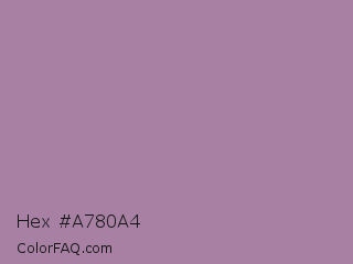 Hex #a780a4 Color is a normal magenta color and the nearest color is Bouquet #ae809e. Hex code #a780a4 and RGB value is rgb(167,128,164). In RGB color space, this color is composed of 65% red, 50% green, 64% blue, In CMYK color space, this color is composed of 0% cyan, 23% magenta, 2% yellow , 35% black , In HSL color space, this color has a hue angle of 305° , 18% saturation and 58% lightness.