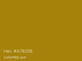 Hex #a7820b Color is a normal yellow color and the nearest color is Hot Toddy #b38007. Hex code #a7820b and RGB value is rgb(167,130,11). In RGB color space, this color is composed of 65% red, 51% green, 4% blue, In CMYK color space, this color is composed of 0% cyan, 22% magenta, 93% yellow , 35% black , In HSL color space, this color has a hue angle of 46° , 88% saturation and 35% lightness.