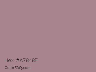 Hex #a7848e Color is a normal rose color and the nearest color is English Lavender #b48395. Hex code #a7848e and RGB value is rgb(167,132,142). In RGB color space, this color is composed of 65% red, 52% green, 56% blue, In CMYK color space, this color is composed of 0% cyan, 21% magenta, 15% yellow , 35% black , In HSL color space, this color has a hue angle of 343° , 17% saturation and 59% lightness.