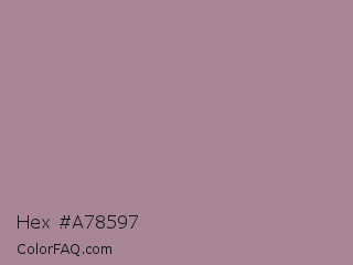 Hex #a78597 Color is a normal rose color and the nearest color is Bouquet #ae809e. Hex code #a78597 and RGB value is rgb(167,133,151). In RGB color space, this color is composed of 65% red, 52% green, 59% blue, In CMYK color space, this color is composed of 0% cyan, 20% magenta, 10% yellow , 35% black , In HSL color space, this color has a hue angle of 328° , 16% saturation and 59% lightness.
