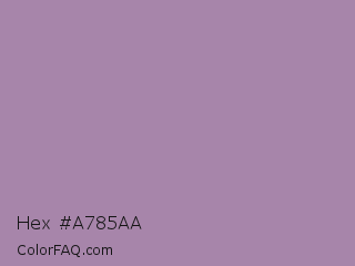 Hex #a785aa Color is a normal magenta color and the nearest color is Bouquet #ae809e. Hex code #a785aa and RGB value is rgb(167,133,170). In RGB color space, this color is composed of 65% red, 52% green, 67% blue, In CMYK color space, this color is composed of 2% cyan, 22% magenta, 0% yellow , 33% black , In HSL color space, this color has a hue angle of 295° , 18% saturation and 59% lightness.