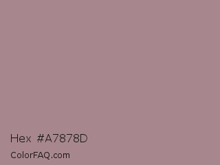 Hex #a7878d Color is a normal red color and the nearest color is English Lavender #b48395. Hex code #a7878d and RGB value is rgb(167,135,141). In RGB color space, this color is composed of 65% red, 53% green, 55% blue, In CMYK color space, this color is composed of 0% cyan, 19% magenta, 16% yellow , 35% black , In HSL color space, this color has a hue angle of 349° , 15% saturation and 59% lightness.